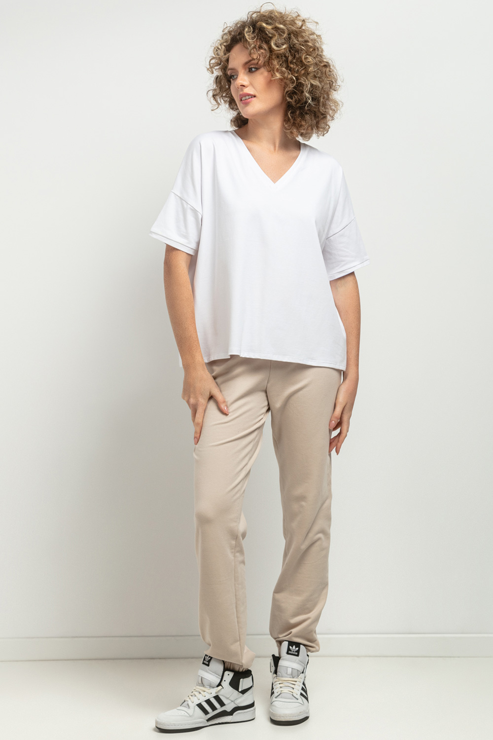 Loose blouse with a feminine V neckline. Sleeve falling, finished with a delicate cuff. At the neckline a decorative pleat. In the striped version the pleat is in white, which makes the blouse even more elegant. Ideal for elegant styling as well as those more casual. Can be worn outdoors as well as tucked delicately into pants or a skirt. This is our MUST HAVE for any occasion. The blouse is sewn in Poland from a knitted fabric with OEKO-TEX Standard 100 certificate. The knitted cotton fabric of Polish production of high quality.