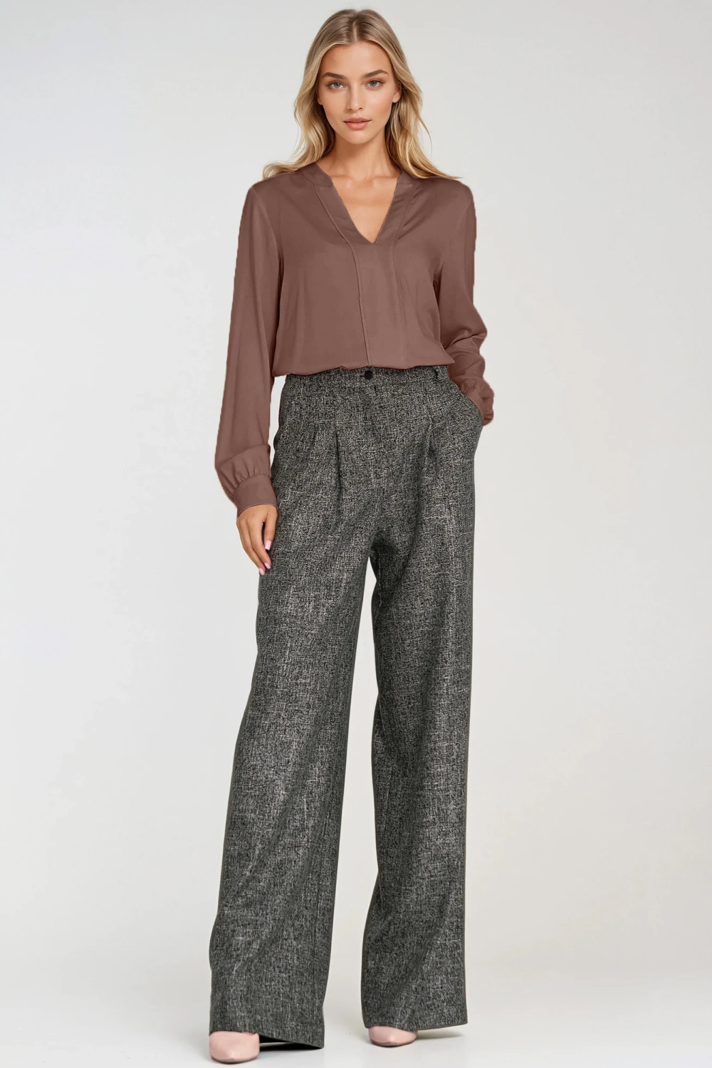 Classic women’s blouse with a regular cut, made of light and breathable viscose. The model has a V-neck with a wide pleat, which visually slims the silhouette and adds elegance to the whole. The blouse has long sleeves with cuffs and is put on over the head, which ensures comfortable wear. The simple, timeless cut makes it perfect for both everyday and office stylizations.