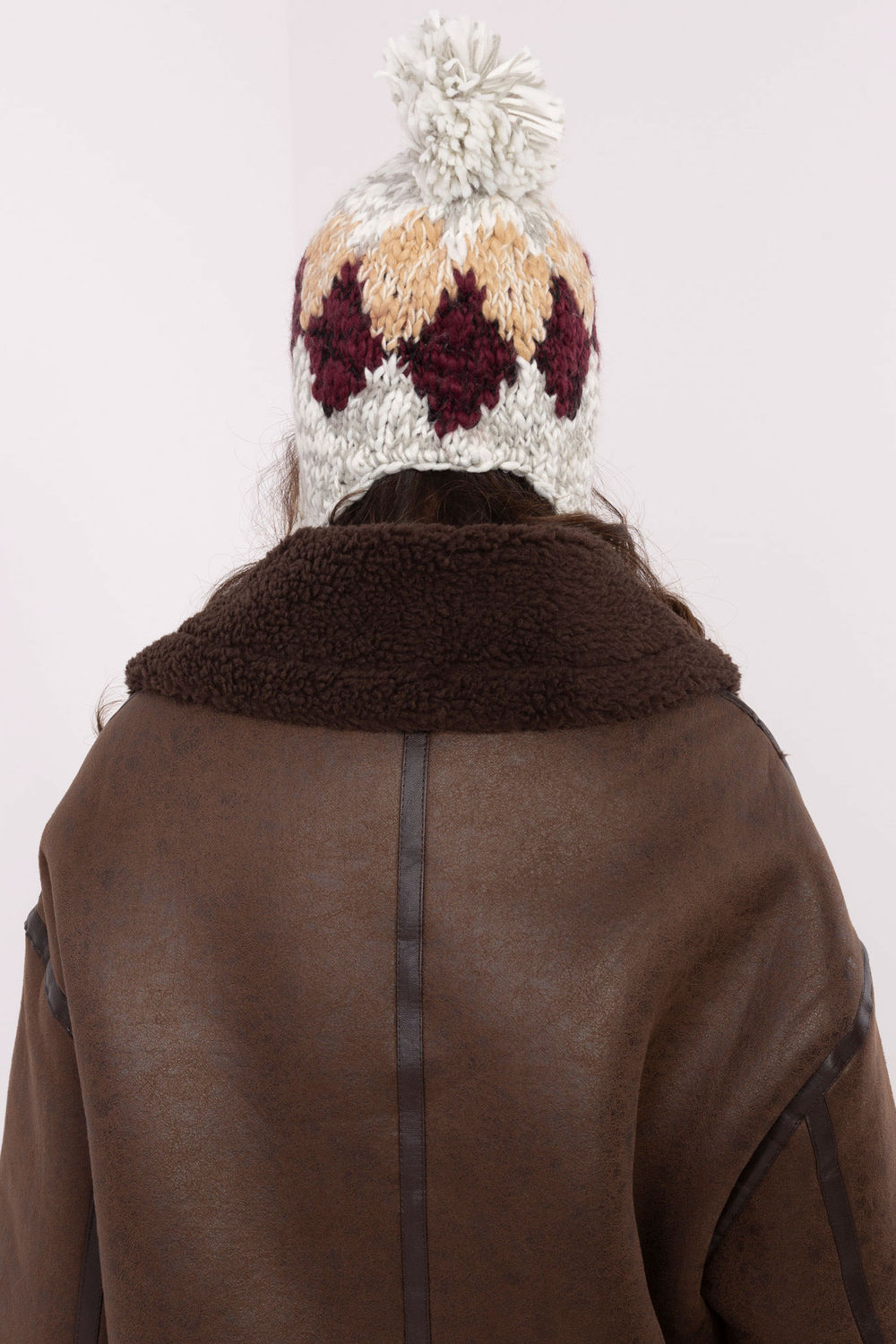 Stylish and functional ear hat is an excellent choice for winter days. Made of warm, soft material, it perfectly protects against the cold, wrapping your head and ears. Its distinguishing feature is the fashionable geometric diamond pattern, which gives it a modern and unique character. Subdued colors, combined with subtle contrasts, make the cap fit into many stylings. An additional accent is the large, fluffy pom-pom on top, which adds to the overall charm and girlish grace. Thanks to the classic cut of the earflap, the beanie provides extra warmth and comfort, perfect for cold, windy days. A combination of practicality and fashionable design, this is the perfect accessory for women who appreciate style and comfort.