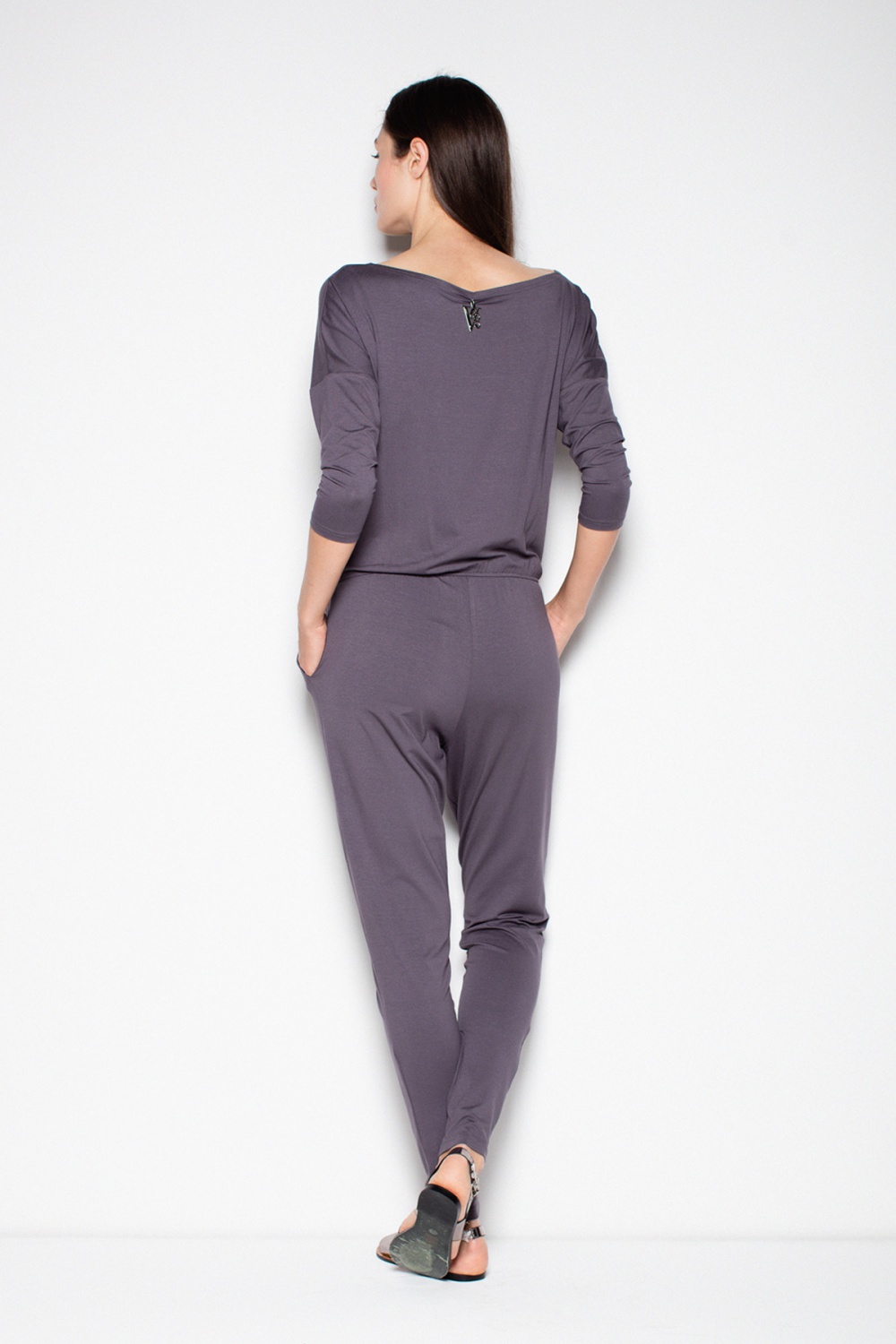 Sporty jumpsuit with a half-round neckline and dropped sleeves, cut off at the waist. Classic cut.