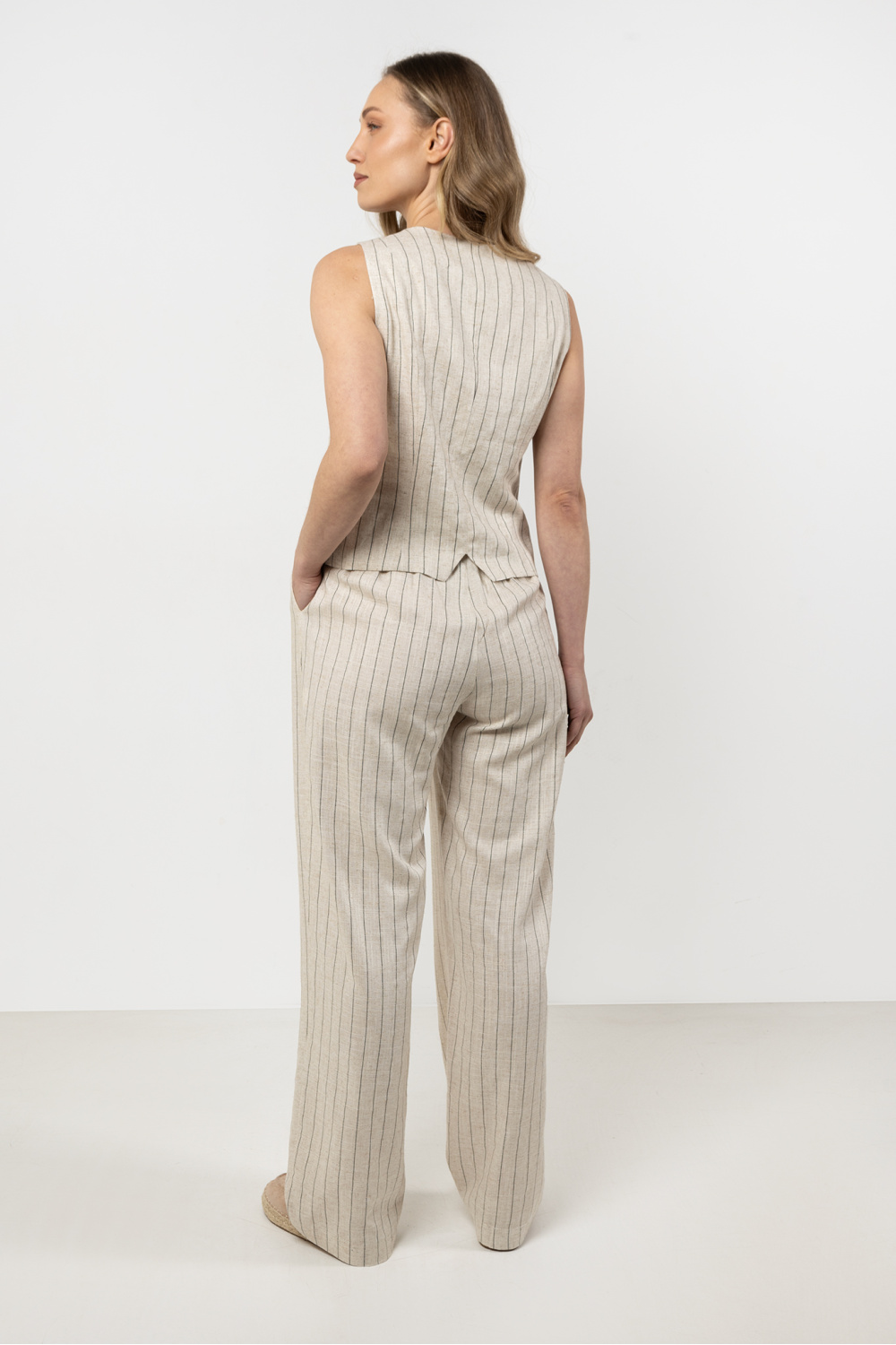 Linen trousers with wide legs in delicate stripes These trousers are the perfect combination of elegance and everyday comfort. Made of linen, they provide breathability and drape beautifully on the silhouette. The wide legs add freedom, while the elastic waistband ensures a perfect fit. The classic pattern of thin stripes makes them suitable for many outfits. Pair the linen trousers with a vest or a blazer made from the same fabric to create an elegant summer look.