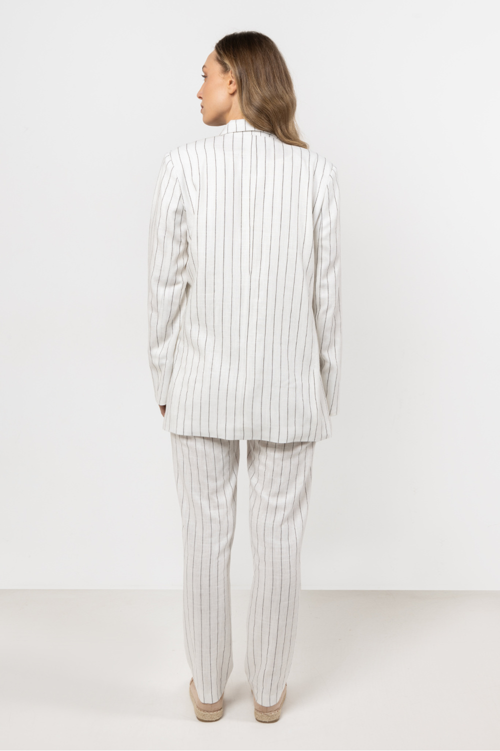 These pants are the perfect combination of style and comfort. The tapered cut subtly emphasizes the silhouette, while the breathable linen ensures comfort throughout the day. The button and zipper closure adds elegance, and the delicate stripes make them suitable for both casual and formal outfits. Pair the linen pants with a vest or blazer made from the same fabric to create an elegant summer look.